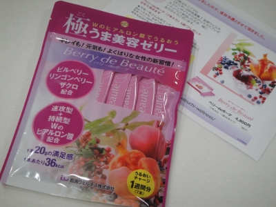 JUGEMテーマ:懸賞、プレゼントモニプラの岩渕ウェルネス から 「ベリーdeボーテ(7本入り)」 いただきました〜1袋に7本のゼリーが入っていました。1日1本食べて、1週間分。さて、どんな効果が実感できるのか・・・ワクワクしながら食べてみたいと思います↑ 写真のゼリーは、1本を半分にカットしたものです。 食べてみると・・・さわやかな甘み、ベリーの風味、適度なかみごたえ、みずみずしい食感商品名に「極うま美容ゼリー」とついているだけあって、確かに美味しいさらに嬉しかったのは、見た目よりも満足感があるということ...