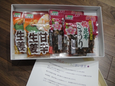 JUGEMテーマ:懸賞、プレゼントモニプラで東海漬物 「甘辛生姜 と 梅昆布きゅうり」 いただきました〜「甘辛生姜」にはしょうが、だいこん、しいたけ、にんじん、こんぶ、ごま 「梅昆布きゅうり」にはきゅうり、しそ、こんぶ、しょうが、ごまが、入っています。どちらも具沢山で嬉しい〜そのまま食べても、もちろん美味しいのですがパッケージの後ろに紹介してあったアレンジ方法を試してみました「甘辛生姜」は、ごはんに混ぜておにぎりに炊き立てのごはんに混ぜて食べると生姜のツンとした辛味が心地よかったです冷めてから食べ...
