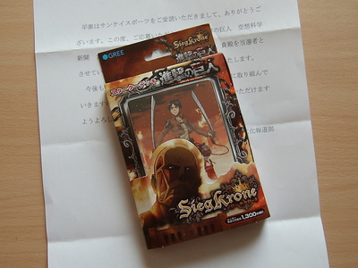 9月の末だったでしょうか。「進撃の巨人 空想科学新聞」というのが出たので購入して読みました。これはその名の通り「進撃の巨人」の世界を科学的に検証するという試みの新聞で、けっこうおもしろいものでした。そしてすっかり忘れていたのですが、紙面にあったプレゼント企画に応募していたものに当選したらしく、きょうその景品が届きました。 カードゲームのグッズです。カードゲームはおろか、ゲームそのものをまったくしないのに、懸賞好きの血が騒いで応募してしまったもの。パッケージの超大型巨人が迫力満点で怖いです。 ...