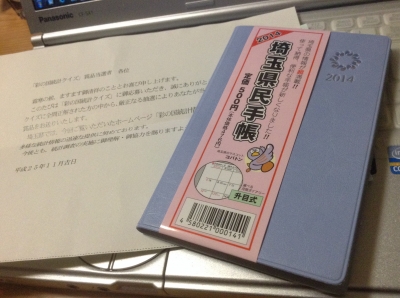 JUGEMテーマ:懸賞、プレゼント「埼玉県統計協会」なるところからクロネコメール便が届いていた。……なんだろう?……と思ったら、「彩の国統計クイズ」の賞品「2014埼玉県民手帳」でした。定価500円で、県庁のほか県内の市町村で販売されています。来年の手帳は、「埼玉県民手帳」で決まりっ!!