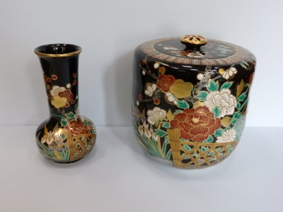 正札会の日が近づいて参りました! 梅雨空で外出が憂鬱な日々が続いてますが 正札会ではたくさんの美術品が 心踊らせてくれることと思います。 今日は皆具をご紹介いたします。 <通次嵩山 仁清黒 四季草花台子皆具> 通次嵩山 京焼の陶芸家 色絵付けが上手で 仁清写などを得意とする (水指 直...
