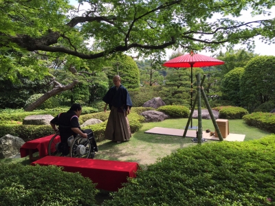 JUGEMテーマ:茶道 松風園http://www.shofuen.net/の「ユニバーサル茶会」に参加しました。いやいや、「しあわせなお茶会」でした。 何しろ若葉がきれい、風が気持ちいい。それだけでじゅうぶんしあわせ。 なのにその上に、焼き物・お酒・主菓子(生菓子)・濃茶・干菓子・薄茶とおもてなしされるんですよ。 うっとりするでせう。 茶道未経験の方がほとんどだったため、お作法関係なし。 お庭で主菓子が出たとき、お運びの方が「あっ、黒文字(楊枝)を忘れました!」と言ったら、ご亭主(おもてなしする方)「じ...