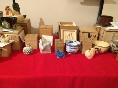 JUGEMテーマ:茶道 昨日は多くのお客様にお越しいただきまして、 盛況でございましたことを心より感謝申し上げます。 春の十翔会は毎年恒例で、来年の干支の品物がたくさん出品されています。 来年は酉年ということで酉にちなんだ香合、置物、茶碗などがございます。 その中でオススメをご紹介いたします。 ・橋本陶正山 薩摩鶏ノ画 茶碗 共箱 ・大樋年郎 白釉 鶏 香合 共箱 ・西村徳泉 染付鶏の絵 茶碗 尋牛斎書付 共箱 ・5代 清水六兵衛 染付鶏香合 共箱 ・鈴木治 青磁 酉置...