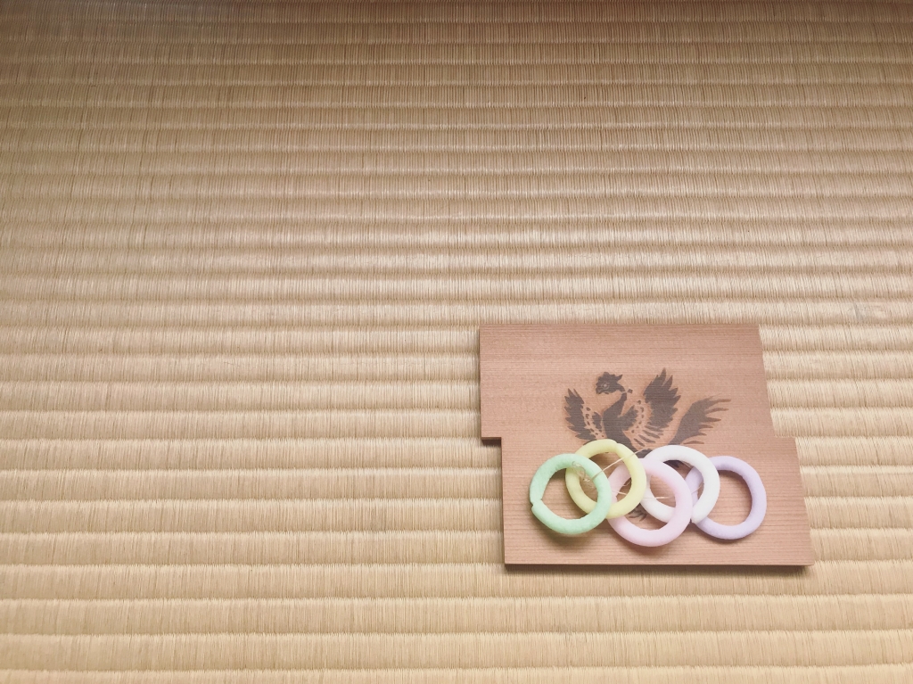藤の花の美しいころ、思い出す御菓子があります。 こちら、名古屋のきよめ餅総本店の藤団子。 (2回連続名古屋の御菓子ですみません。) 紫、白、桃、黄、緑の五色の環を麻ひもで結び、藤の花に見立ててあります。 なんとも可愛らしいお菓子。 お店の見立ては藤の花だけど、 もし茶会の亭主ならば、お客さんにどうやって出そうかな、と考えるお菓子ですね。 ひとつずつ好きな色を取ってもらう? 木の...