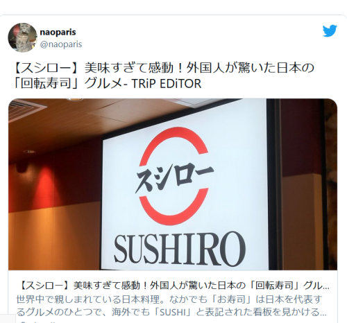 JUGEMテーマ:グルメ JUGEMテーマ:【MADE IN JAPON】【Inventions Japonaises】【日本の発明】 【日本の外食】【コスパ最強】【回転寿司】【スシロー】 【絶品グルメ】【コスパ最強】1位はどこだ!?人気「回転寿司」チェーンランキング 【コスパ最強】1位はどこだ!?人気「回転寿司」チェーンランキング【絶品グルメ】- TRiP EDiTOR https://t.co/4Y65EuYoHq — naoparis (@naoparis) May 5, 2021 【スシロー】美味すぎて感動!外国人が驚いた...