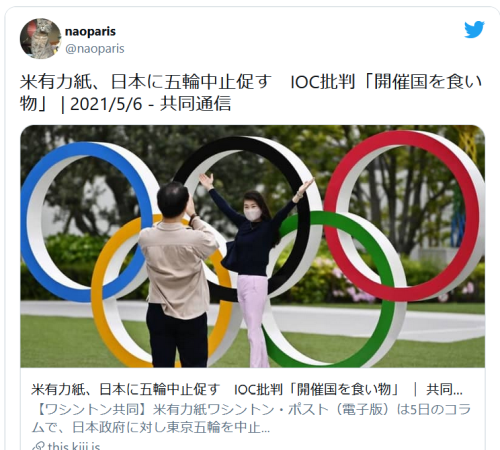 JUGEMテーマ:【MADE IN JAPON】【Inventions Japonaises】【日本の発明】 【JAPON】「東京五輪」 ついに!米ワシントン・ポスト紙が五輪中止促す「東京はIOCに略奪は他でしてくれと告げるべき」 (2021年5月6日) - エキサイトニュース ついに!米ワシントン・ポスト紙が五輪中止促す「東京はIOCに略奪は他でしてくれと告げるべき」 (2021年5月6日) - エキサイトニュース https://t.co/bfKQ2j8i4p @ExciteJapanより — naoparis (@naop...