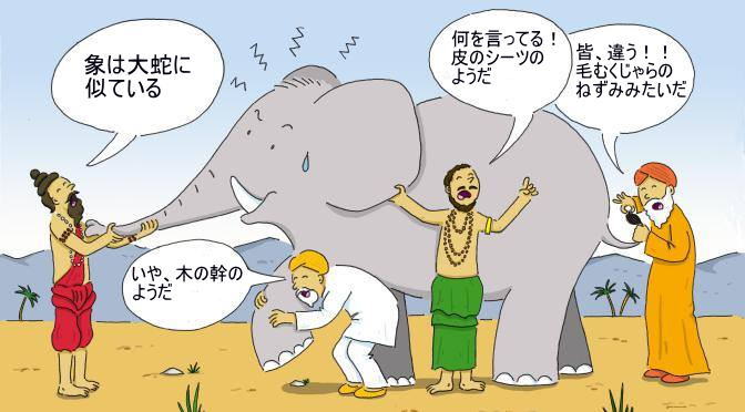 下の絵をご覧ください。 生まれながらにして目が見えない4人が象について語っている様子が描かれています(原典では6人)。 ですから、象がどのような動物であるかを知りません。 鼻を触っている人は、象のことを蛇に似ていると言い、脚を触っている人は木の幹、耳を触っている人は皮のシーツ、尻尾を触っている人はネズミだと言っています。 それぞれの人が言っていることは、間違っているでしょうか? 決して間違っているというわけではありませんね。 しかし、完全ではありません。 この話から学ぶことが...