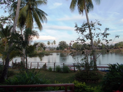 写真−1 コーン島はメコン川の中州で一番大きい島になり、人口は5万人近く居るらしい。写真1は泊まったホテルの部屋のベランダから眺めた水路で、向こう側はテッド島になり、水路両側は外国人相手の宿泊設備が並び、テッド島側はニッパヤシを屋根に葺いたコテージが並びお金のかからない旅行をする人々が自転車や徒歩でゆっくり移動しているのが良く見える。 このホテルはベランダの奥行きが深く、水路を流れる水を眺めるには最適で、時間があったら何日も居たかった。写真−2 ホテルのある辺りが島の中心地になるようで、写真2は船...