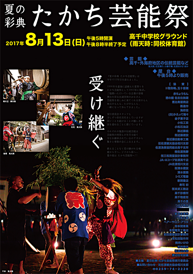 今年で15周年を迎える『夏の彩典 たかち芸能祭』。 15年という歳月を噛み締めたくて、ポスターのテーマは「受け継ぐ」にしました。 黒バックにダークグレーの配色で、 うっすらとメッセージを込めてあります。 『夏の彩典 たかち芸能祭』は 今年で15年目を迎えました。 1996年を最後に途絶えた夏祭りを たかち芸能祭として2003年に復活。 ご協賛いただいている企業の皆様 舞台を彩る出演団体のみなさん 芸能祭を楽しみに来てくれる世のもん ...