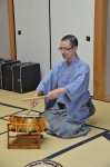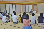 7月9日(日)午後2時より、恒例の「狂言ワークショップ」を市民会館4階和室で開きました。 4才から62才まで、18名の方が参加してくれました。 大蔵流狂言方の善竹忠重師率いる「志芸の会(しげのかい)」の皆さんに、楽しく指導していただきます。 まず牟田素之師より、狂言のことを簡単に説明していただきます。 次に、狂言「盆山」を鑑賞。 装束こそつけませんが、演じている人の息遣いも感じられる距離で演じる狂言を楽しんでいただきます。 ...