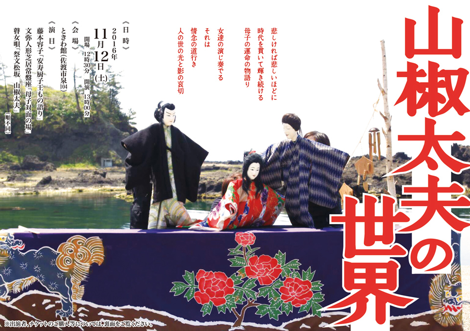 『山椒太夫の世界』 悲しければ悲しいほどに 時代を貫いて輝き続ける 母子の運命の物語り 女達の演じ奏でる それは 情念の道行き 人の世の光と影の哀切 《 日 時 》 2016年11月12日(土) 開場 12時30分 開演 13時00分 《 会 場 》 ときわ館(佐渡市泉104) 《 演 目 》 藤本容子「安寿厨子王もの語り」/文弥人形芝居常盤座「母子対面の場」/瞽女唄「祭文松坂 山椒太夫」(順不同) ...