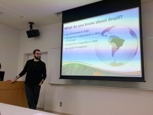 #国際交流 10月16日、国際交流会が行われました。 ジョシュア先生と留学生ルシアさんとのプレゼンテーション。 たいへん勉強になりました。 国際交流委員の人たち、お疲れ様でした。 何か怪しい通訳でしたが。。。