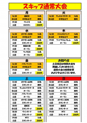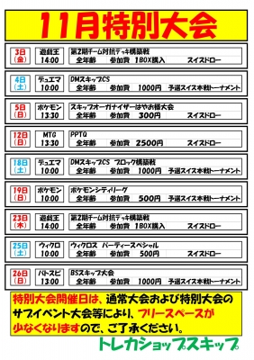 JUGEMテーマ:その他 ★スキップ11月特別大会★ 詳しくは下記URLで(^o^)丿 遊戯王 11月3日・23日 http://www.yugioh-card.com/japan/event/deck_build_duel/second.php デュエマ 11月4日 http://www.izazin.com/taikai/72014068 デュエマ 11月18日 http://www.izazin.com/taikai/12454074 ポケモン 11月5日 オープン http://www.izazin.com/taikai/27974265 中学生以下http://www.izazin.com/taikai/78434266 ポケモン 11月19日 シティリーグ htt...