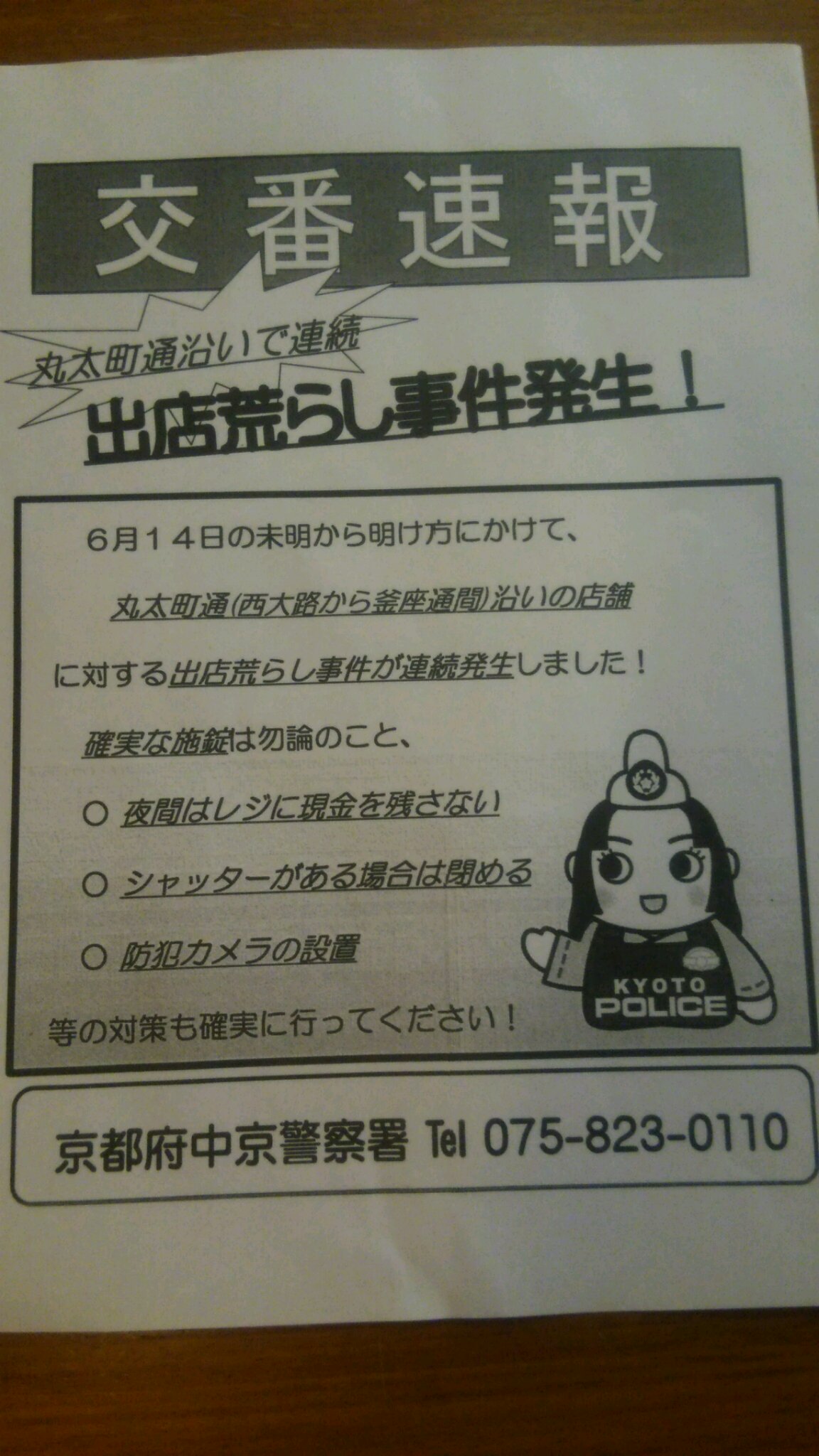 JUGEMテーマ:その他 交番速報 今日、警察が、このチラシを持ってこのあたりを 回っておられました。 夜中に店舗に泥棒が連続で入ってるそうです・・・ 気を付けないと・・・ 皆様も気をつけて下さい 京都市で育毛するなら『ヘアーブティック デ・ジャ・ヴュ 』