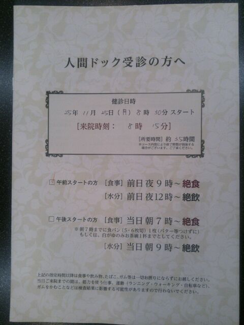初の人間ドック 月曜日に初めて人間ドックを受診しました。 胃カメラがあるので写真の様に絶食です。 絶食・絶飲は意外と大丈夫ですが、精神的にしんどいですねェ・・・ 当日は、淡々と検査項目をこなして行きますが、最後のデザートに胃カメラが・・・ 実は、胃カメラは初めてでかなり緊張しておりました。 施術室の前室に通されて、何かの薬を飲まされながら、 看護師さん「気分は大丈夫ですか?」 小生「大丈夫です」 看護師さん「初めてですか? すぐ終わりますから大丈夫ですよ・・」 小生「...