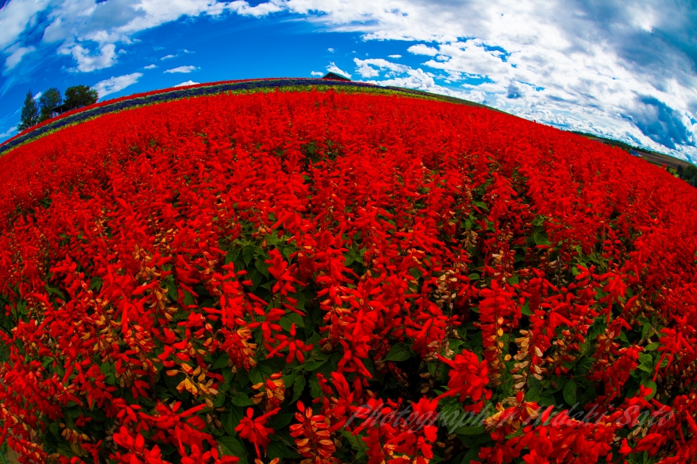 どうしても平凡な美瑛の写真になってしまうので、魚眼レンズの力を借りて、インパクトを植え込みました。相変わらず花の名前はわかりません。 美瑛のお花畑は、無料で見物出来る所が多いです。でもね、売店と喫茶スペースが有る事が殆どなんで、皆さんお金を落としましょうよ! 車停めて、花の写真撮って、トイレ借りて帰っちゃう人も多いみたいですが。買う物は無かったし、喉も乾いていなかったので、募金箱に少々入れて参りました。 Nikon D5 +SIGMA 15mm/F2.8 FishEye JUGEMテーマ:photo