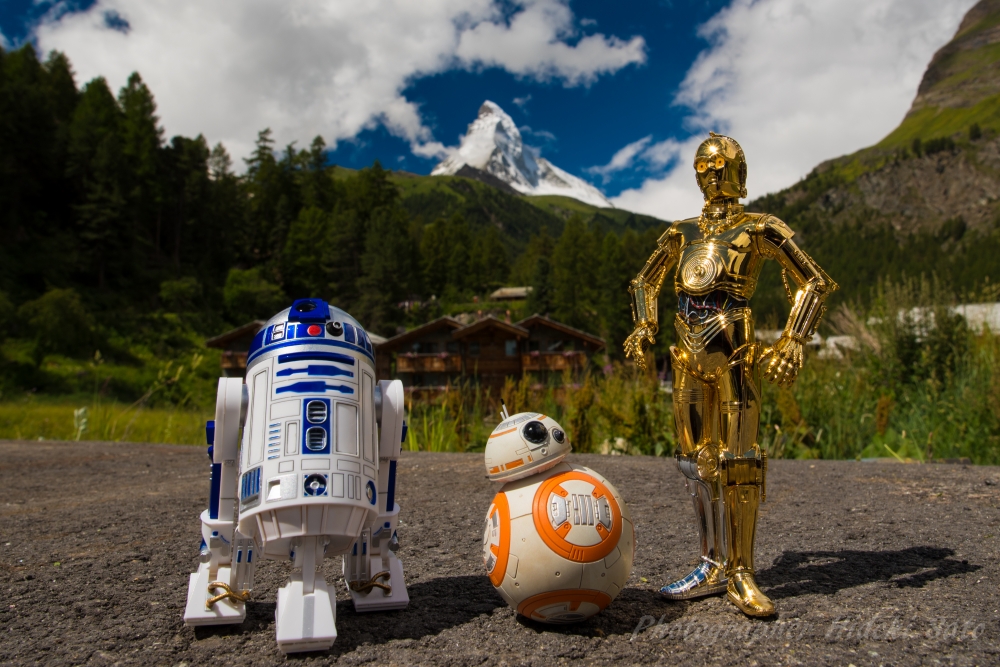 ドロイドと名峰マッターホルン。快晴のツェルマットより。とっても特徴有る形なので有名ですね! Nikon D750 + AF-S 20mm/F1.8(1/50、F14、ISO100)
