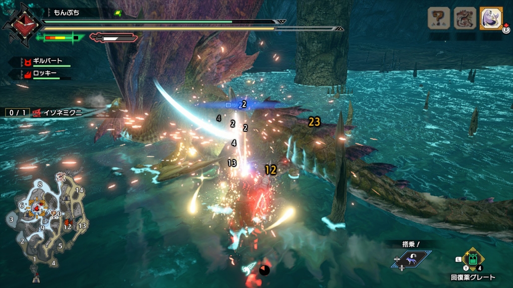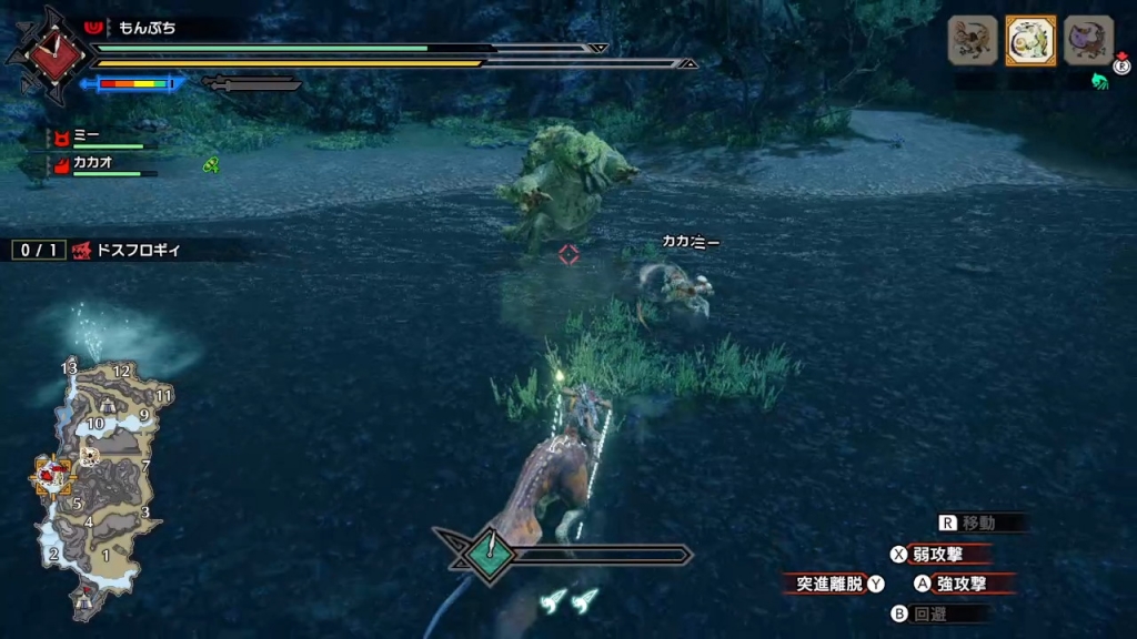 JUGEMテーマ:ニンテンドースイッチ(Switch)ゲーム全般 設定を少しいじった。(勝手に納刀をオフにして、カメラを50%の距離まで離したりした) それで集会所の星4クエを終わらせる事にした。残っているのはドスフロギィ。 ヨツミワドウが乱入。操竜状態になったのはドスフロギィ。こういう場合には、相手にYでぶっつける。 すると、すぐにヨツミワドウに乗れるので、それでドスフロギィにダメージを与える。 気分良く星5へ。 とりあえずボルボロス。見えない所でどう動いて...