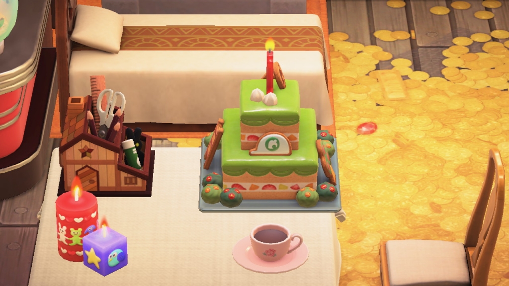 JUGEMテーマ:ニンテンドースイッチ(Switch)ゲーム全般 サンリオコラボのアミーボカードはやっぱり抽選で落ちた。で、そんなもんだろうと思いつつアプデをまっていたら、今回自動更新なくて、さっき+ボタンでソフトの更新をかけた。たぬき開発から、一周年記念ケーキが届いた。回してみる。 たぬき開発のマークが見える。 ここにも。 フルーツケーキでクリームは抹茶と推測。砂糖菓子とアイシングクッキーでデコレートか。 低木はツバキ。やはり3月に花の咲く物を選んで...