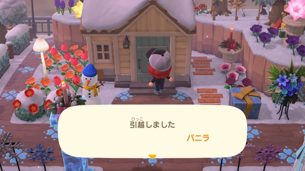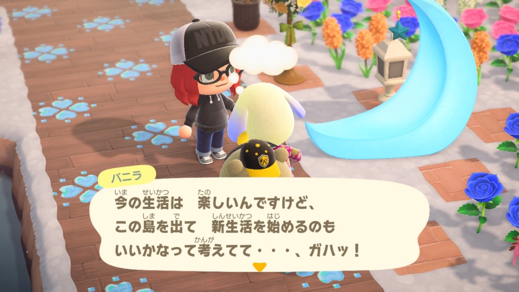 JUGEMテーマ:ニンテンドースイッチ(Switch)ゲーム全般 今日はジャスティンかと思って近づいたら、その陰でバニラが悩んでいて、話しかけたら離島申請だった。 そもそも預かり住民だったのでOKした。 今日は休日なので、子供1号と相談で今日の内にもらわれていく可能性もある。(ヤツまだ起きとらん) カーニバルまで一緒に居られなかったのは残念だが、すぐ会えるので良しとしよう。 ちなみに他所の島へ行くと、口癖はリセットされる。……あげた服とか物は持ってい...