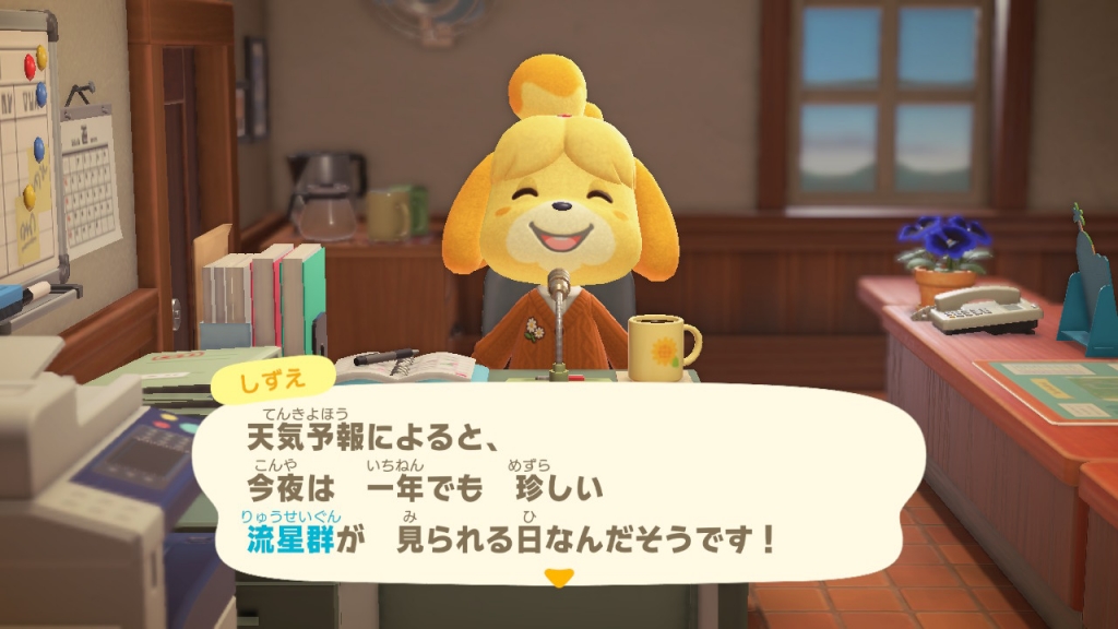 JUGEMテーマ:ニンテンドースイッチ(Switch)ゲーム全般 何か月かぶりに流星群が来た。 土曜日だった。と言う訳でフーコ不在。 住民も流星の話題で話が。 とりあえず祈る。 キャラメルの家をトムソンの家と入れ替えるので、キャラメルの家を移設した。明日はこの当たりを造成予定。