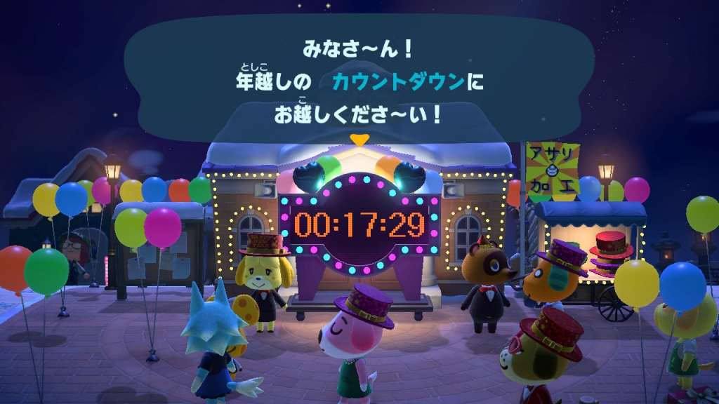 JUGEMテーマ:ニンテンドースイッチ(Switch)ゲーム全般 子供が「変化ない」と言うのでゲームを立ち上げたら、うちはこんな感じにアナウンスが。子供、楽しみで2時間前から放置していたから動作がおかしかったっぽい。このまま見る事にした。 10分前から音楽が変化、まだ帽子や眼鏡などを付けていなかった住民がくるりんぱ。 室内住民もしっかり正装&ニューイヤー帽子。 五分前から、広場の住民はライトセイバー装着。 「ニャッ、ニャッ」ってめっちゃ可愛いカウントダウ...