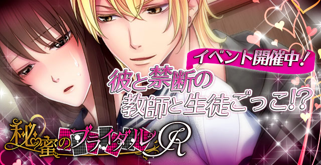 JUGEMテーマ:乙女ゲー 秘蜜のブライダル 〜R〜 期間限定イベント「ヒミツのDesire」 6月17日(金)15時〜6月22日(水)15時迄開催!! 今回は一樹と智流の2コース、2エンドにて 蜜、艶の2種のお話をお楽しみ頂けます。 一樹ルートでは、教室で一樹さんのくちびるが近づいて…!? 誰もいない教室で行われる ふたりの秘密の授業――。 智流ルートでは、保健室でベッドに両腕を押し付けられて…!? 校舎の中、人目を忍んで…… 危険な教師と、淫らな関係――。 チッ...