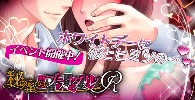 JUGEMテーマ:乙女ゲー 秘蜜のブライダル 〜R〜 期間限定イベント「Kissより甘く」 2月26日(金)15時〜3月3日(水)10時迄開催!! 今回は遥真と澪斗の2コース、3エンドにて 通常、蜜、艶の3種のお話をお楽しみ頂けます。 遥真ルートでは、どうしたらセクシーさが身に付くのかと悩んでいたら 遥真さんが、特別なプランを用意してくれて…… ホワイトデーのお返しに遥真さんがくれたモノは…!? 澪斗ルートでは、仕事でレッスンに通いつめていた澪斗さんと ホワイトデーはゆっくりで...