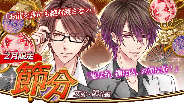 愛属ブラッドバース 〜ヴァンパイアの花嫁〜 2月の更新予定 ◆1月22日〜2月26日 2月限定シナリオガチャ 「節分」 文弥&陽斗編 配信 ◆1月29日〜2月5日 2月イベント 『ナイトパーティー〜バレンタイン〜』 配信キャラクター:陽斗・廉貞・文弥・陸 ◆2月19日〜24日 ミニイベント『プチパーティー〜ひなまつり〜』 配信キャラクター:陽斗・潤一郎 ◆2月下旬 北大路光斗 本編シナリオ配信開始 ◆2月下旬 北大路光斗配信記念ミニイベント 『シャンデリアナイト』 ◆2月下旬 3月限定...
