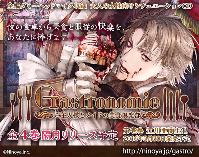 大人の女性向けシチュエーションCD Gastronomie(ガストロノミー) 〜ご主人様とメイドの美食倶楽部〜 リリース決定!! 公式サイト:http://ninoya.jp/gastro/ <あらすじ> 時代は昭和20年代後半。 東京銀座のビルの中に「ガストロノミー」という名の高級フレンチレストランがあった。 そこでは月に一度、「美食倶楽部」という厳選された会員だけが集う会合が行われ、 変人たちが集まっては美味しい料理とデザート、そしてワインに舌鼓を打っていた。 会合で食べる料理は、交代で会員たちが決め、 必要な料理人や食...