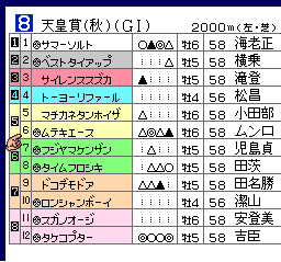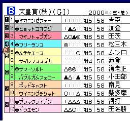 またしても凱旋門賞挑戦が成らなかった ダビスタ98。   秋のG?緒戦は オークス馬がG?2勝目。   天皇賞(秋)には5頭。 ここは貫禄のG?7勝目。 天皇賞春秋制覇。   エリザベス女王杯には2頭。 4歳の2冠馬と、このレース2連覇中の8歳馬。 直線あっさりと抜け出す8歳馬。 今年初勝利だが、このレースのために現役続行した。 6歳から3連覇。G?4勝目。   マイルCSは連覇を狙うワカオライデン産駒 余裕...