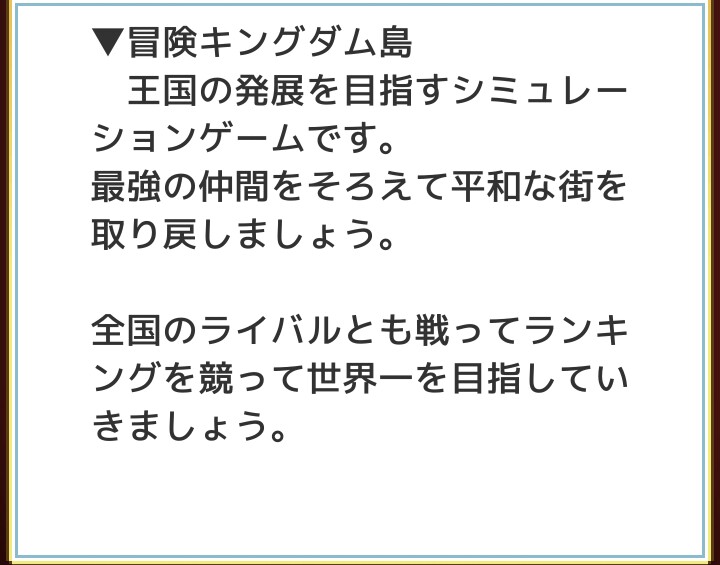 JUGEMテーマ:自由度の高いゲーム 最近ハマってるのがこの「冒険キングダム」です。 基本無料で出来て課金も一応出来るけどやらなくても十分に楽しめています! なぜツボに入ったのか自分でも??なんですが、目的は領土を敵から守り、開拓していくゲ−ム。 有りがちなんですが、自由度が高いのと職業が多く自分好みな感じなんです。 これからは冒険キングダムを中心にアップしていきたいです。