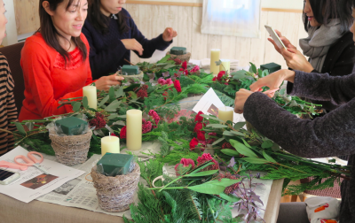 JUGEMテーマ:アロマテラピー こんばんは muguetです。 先日ご案内しましたクリスマスアレンジメントのレッスンのご報告です! とても楽しい時間で皆様、笑顔いっぱいのレッスンとなりました。 今回のアレンジのテーマは 「聖なる夜のキャンドルアレンジ」 *針葉樹のグリーンたち *スプーレーバラ *シックなカーネーション・ノビオバーガンディ *ユーカリ *ピンクペッパー *姫リンゴ *松笠 こんな花材をご用意しました。 資材、...