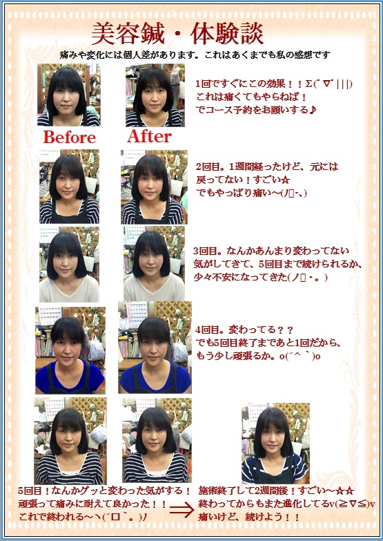 JUGEMテーマ:キレイになる為に!! 美は一日してならず 美容鍼灸を体験されたM.Tさんがなんと美容鍼灸体験レポートを作って下さいました! 写真で見比べるとその差は歴然ですね。今後もメンテナンスで美容鍼灸をされるそうです。 嬉しいレポートありがとう御座いました。 感謝です。