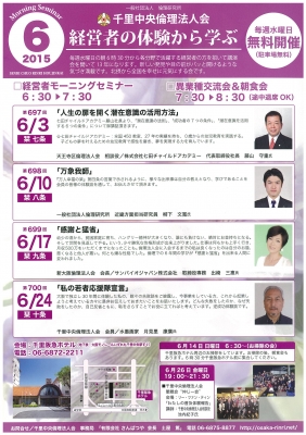 JUGEMテーマ:WAO!! 千里中央倫理法人会、土屋篤とご縁があった方にお送りしております。 6月3日(水曜日)モーニングセミナーは天王寺倫理法人会 相談役 ?七田チャイルドアカデミー 代表取締役 藤山守重氏迎え 「人生の扉を開く潜在意識の活用方法」をテーマにご講和頂きましたが皆さんどうでしたか? もう素晴らしい講話で私は天王寺倫理法人会はしあわせ者〜〜と思いました〜! いや違う!大阪府倫理法人会が幸せ者〜ですね!!胸に突き刺さりました!今私の一番の悩みがす〜うっと 消え明確なこれや〜!と思...