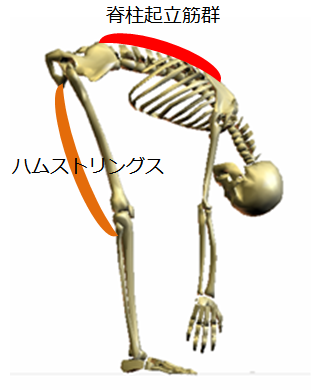 JUGEMテーマ:ヨガ・ストレッチ多関節筋の例を、もう1つ出しましょう。手や足なら、「ここが関節だ!」ってわかりやすいですよね?だから、ちょっと注意すれば、前回お話したストレッチの危険性を回避出来るかもしれません。問題は、背骨 です!下図のように、身体を前に曲げて背中を伸ばすストレッチ・・・これもお馴染みだと思います。背中には多関節筋がたくさんあるので、とりあえず脊柱起立筋(赤)で一括りにしておきます。このストレッチでも、前回と同じ危険性が脊柱起立筋とハムストリングスの関係で起こるんですが、同じ話...