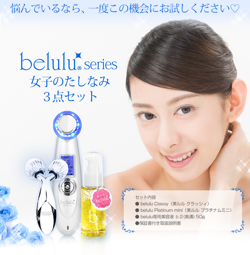 JUGEMテーマ:美顔器・美容機器 徹底美顔!美顔器 美ルルクラッシィ 女子のたしなみ3点セット 徹底美顔!美顔器 美ルルクラッシィ 女子のたしなみ3点セット 潤いとハリ、両方欲しいから選びました。 たるみ、しわ、くすみ、毛穴、にきび、テカリ belulu series 女子のたしなみ3点セット! 毎日のケアにリフトアップをプラスしたい! そんな声にお答えして、大人気の美ルルクラッシィに、美顔ローラーをお付けした特別セットが誕生! 徹底美顔!美顔器 美ルルクラッシィ 女...