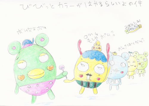 なんだぁ〜!?この色彩鮮やかな生物はぁ〜!つうか流行のビビッドカラー?ネオンカラー?だし。。。と思ったら、バロンがマジで親し気に話しかけてるけど、そう言えばタマゴみたいな見た目が似てる気がするダス。。。あっ、名前はボムって言うんダナヤ( ̄_ ̄ i)JUGEMテーマ:絵日記★JUGEMテーマ:オリジナルキャラクター