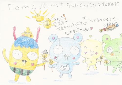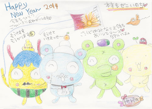 あけおめことよろぉ〜!2014年もわれらお気楽極楽軍団をよろしくお願いいたしますっ!めでたすぎてバロンのウンコも金色に輝いちゃいました(^O^)/JUGEMテーマ:絵日記★JUGEMテーマ:オリジナルキャラクター