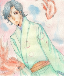 JUGEMテーマ:オリジナルキャラクター 「解けぬ繰り糸であろうと、解くのみだ」 // 絢匡。 めずらしくカラーイラスト。 金魚を描くのが楽しかったです(そこなの)