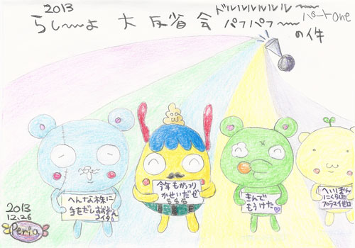 さぁさぁもう年末ですから、ここいらへんでアタクシどもの2013年の奇行を振り返って来年の更なる発展をいのりやしょう!らし〜よさん...それは致命的!でもまぁmixiもだいぶ戻してきたし大丈夫ぢゃね?バロン...よくわかんねぇ〜けど、この余裕がビリオネアなんダスね!あの豪邸にまた行きたい!チルピル...金で儲けたの?いつの間に??プピン...平凡が一番ダス(●´ω`●)ゞ 平和のありがたみを思い知るよねぇ〜!これってファイナルアンサー?みんな仲良しで正直でよろしい!JUGEMテーマ:絵日記★JUGEMテーマ:オリジナルキャラクター...