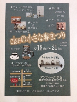 JUGEMテーマ:創作活動 〜イベント参加のお知らせ〜 5月18日〜21日(木曜〜日曜) 「アンティークcise」さんの春のイベントが開催されます。 特設されるオーガニックコーヒーのcafeに合わせて、 コーヒーと一緒に頂ける手軽なケーキ類をご用意する予定です。 アクセサリーや小物類のマーケットなどもあるそうなので、 よろしかったら、ぜひいらしてみてくだい! https://www.facebook...