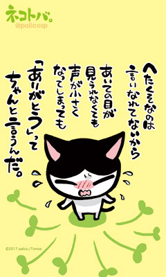 へたくそなのは 言いなれてないから 相手の目が 見られなくても 声が小さく なってしまっても 「ありがとう」って ちゃんと言うんだ。 * * * * * (上の画像はクリックで480×854が出てきます。 スマートフォンの待受などにどうぞ。) 本日のネコトバは、「ありがとう」が上手に・素直に言えない方へ。