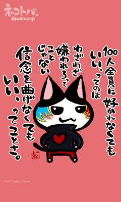 100人全員に好かれなくても いい、ってのは わざわざ 嫌われろって ことじゃない 信念を曲げなくても いい、ってことさ。 * * * * * (上の画像はクリックで480×854が出てきます。 スマートフォンの待受などにどうぞ。) なぜか悪役レスラーっぽいメイクになりました。