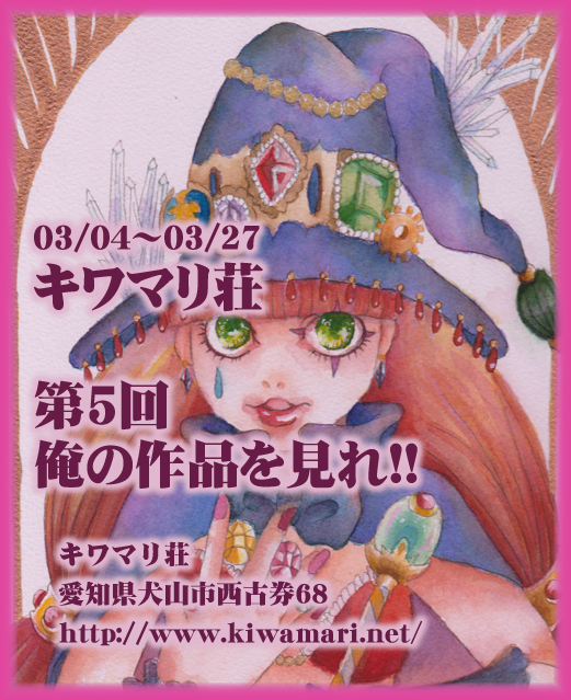 JUGEMテーマ:創作活動 先週03/04からキワマリ荘の「第5回 俺の作品を見れ!!」に作品を展示していただいています。 この企画展に参加するのは2回目になります。 今回はいつも描いている感じの絵です。 実はこの絵は下書き自体は昨年描いていて色を塗れませんでした。 でもこの企画展に向けて色を塗って完成にこぎつけました。 日の目を見れて良かったです。 この展示会ジャンルは決まっていなくて色々な作品が集まる面白い企画です。 月末にはすごいことになってそうです。 ...