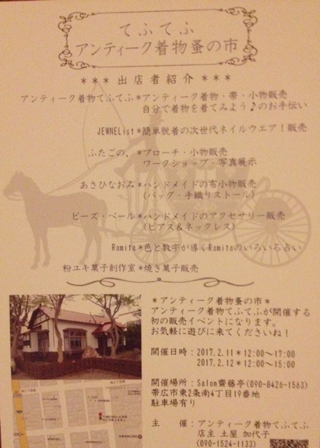 〜イベント参加のお知らせ〜 2月11(土曜)、12日(日曜)、 帯広市内のアンティーク着物のお店「てふてふ」さんの 主催するイベントに焼き菓子で出店させていただきます。^^ https://www.facebook.com/アンティーク着物-てふてふ-1616740135266227/?hc_ref=PAGES_TIMELINE 先日「てふてふ」の土屋さんにお会いして、 アンティーク着物のほうも手に取って見る機会がありまして。 繊...