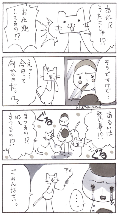 JUGEMテーマ:創作活動 うたこしゃは 基本的に お化粧をしません。 ゆえに たまにお化粧をしていると なにごとかと ネコは思います。 さぁ 白状するニャ うたこしゃ。 でぱーとなの? カフェーなの? この 作品 は クリエイティブ・コモンズ 表示 - 非営利 - 改変禁止 4.0 国際 ライセンスの下に提供されています。