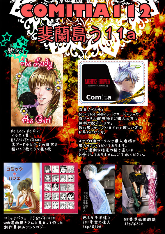 そんなわけで大変遅くなりましたがコミティア112のお品書きを作りました。 お品書き久しぶりすぎて;こんなんでいいかしら…。 あと、一応こんな感じで昨日ICカードステッカーが無事に届きまして。 ICカードステッカーは単純に自分が欲しかっただけです(笑)自分用に作るんなら少し配ろうかなって感じで(しかも貼りたかったのはスタバのカード)。 当サークルの配布物をお買い上げの方に無料でお配りします。数に限りがございますので欲しい方は早めにどうぞ。 あとスケブですが、こちらも当サークルでご購入いた...