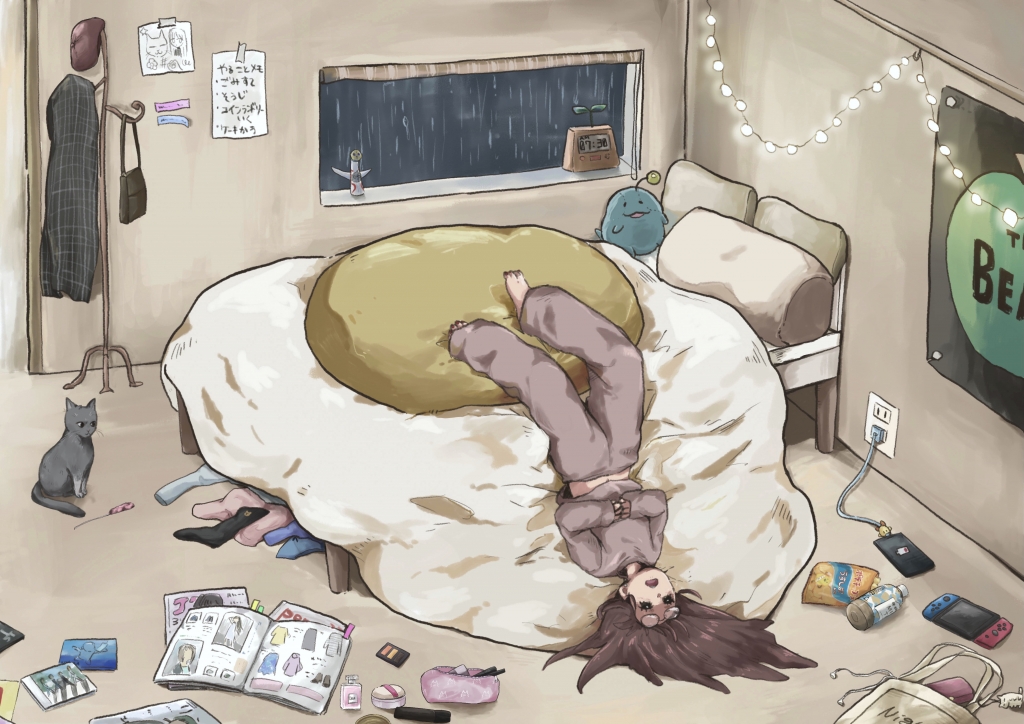 JUGEMテーマ:イラスト こんにちは〜! 今回は雨の薄暗い朝の部屋をテーマに書いてみました。 月曜日の朝で、雨もすごくて会社行きたくないってなってる女の子と遊んでほしい猫様(笑) iPad版メディバンペイントで描きました。最近iPadで完成させる事も増えてきました。 プロクリエイト買うか迷い中です( ³⌓³) ラフはこんな感じで、だんだん物が増えていきましいた。だいぶごちゃごちゃして、生活感UPしました。 だら...