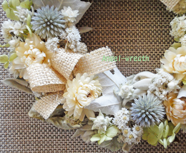 JUGEMテーマ:*リース* 久々にナチュラルカラーのおとなしい感じのリースを作りました(^^)シルバーやホワイト系のドライフラワーにコットンのベージュリボン使いのリース☆ところどころに抑えめカラーのルリタマアザミやアナベルが入っています。お部屋にこんな色合いのリースを飾るとゆったりした雰囲気が生まれそう・・6月になって梅雨に入った地域もあるようですがちょっとうっとおしい季節にいいかもしれません。北海道は、なんだか寒いくらいのこの頃なのですが・・〔 シルバーベージュのリース はこちら 〕 『リー...